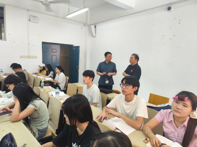 本站讯(学生记者 谌妤 记者 袁璐)金风送爽,书韵飘香。9月4日,伴随着新学期的第一缕晨光,我校迎来了老生上课的第一天。为全面、精准地掌握教学运行状况,切实保障教学质量,校领导们走进教室,深入教学一线随堂听课,并在课后与师生深入交流。 早上八点,校党委书记李国金,校党委副书记、校长蔡海生等校领导一行,以“随机进班、现场观察”的灵活方式,对《毛泽东思想和中国特色社会主义理论体系概论》《习近平新时代中国特色社会主义思想概论》《马克思主义基本原理》等课堂教学情况进行了细致入微的检查。他们重点检查教师到岗、学生出勤、课堂纪律以及教学设备运行等,力求全方位、多角度地了解新学期教学工作的实际开展情况。