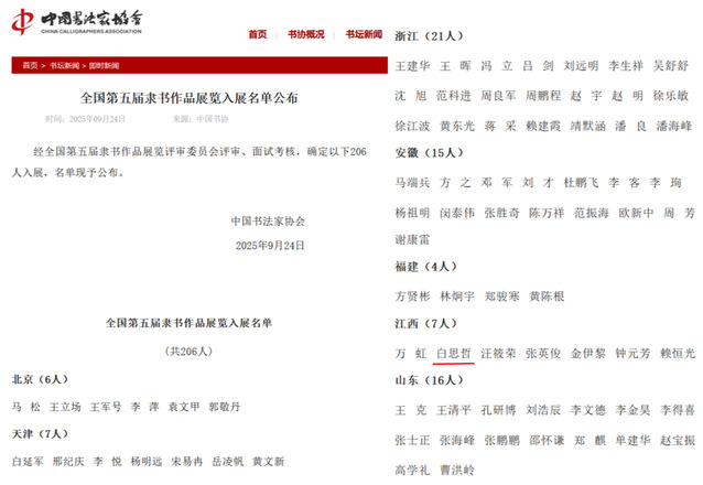 本站讯(美术与书法学院 供稿)9月24日,中国书法家协会正式公布“全国第五届隶书作品展”入展名单。美术与书法学院书法学专业2023级本科生白思哲同学创作的隶书作品,从全国15214件投稿作品中脱颖而出,成功入展。 白思哲同学此次入选,实现了我校本科生在中国书法家协会主办展览中“零的突破”,是学院书法学专业长期坚持高水平教学、注重实践创作、强化人文素养培育的代表成果之一,也是学院近年来持续推进“展赛并进”一院一品项目建设的重要成果体现。该项目建设以“以展促学、以赛促练”为理念,注重将课堂教学与专业展赛有机衔接,积极鼓励学生参与高层次创作实践,有效提升了学生的专业素养与创作能力。 值得一提的是,该院书法学专业2022届毕业生马如飞的作品也同期入选该展览。 图文一审:易 凯 图文二审:刘庚凯 图文三审:杨礼浪 |
