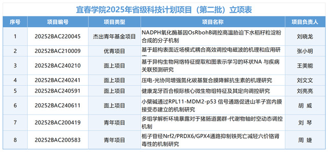 本站讯(科学研究处 供稿)接江西省科学技术厅《江西省科学技术厅关于2025年省级科技计划第二批项目和职业早期青年科技人才培养专项项目立项的通知》(赣科资发[2025]36号)文件通知,我校共有8项课题喜获2025年江西省科技计划立项资助,获105万元下达经费资助。其中杰出青年基金项目和优秀青年基金项目各1项,这是我校首次获杰青、优青项目资助。