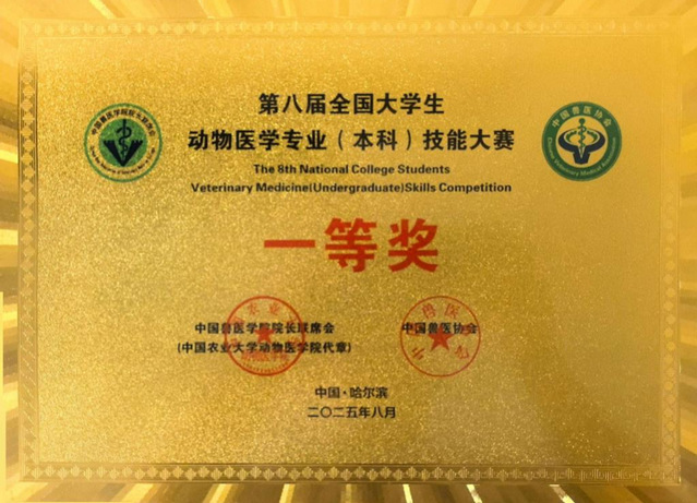 本站讯(生科学院供稿)8月18日至21日,第八届全国大学生动物医学专业(本科)技能大赛在哈尔滨成功举办。生命科学与资源环境学院动物医学代表队在比赛中表现优异,荣获团体一等奖,充分展现了我校动物医学专业的教学实力和学生的综合素养。