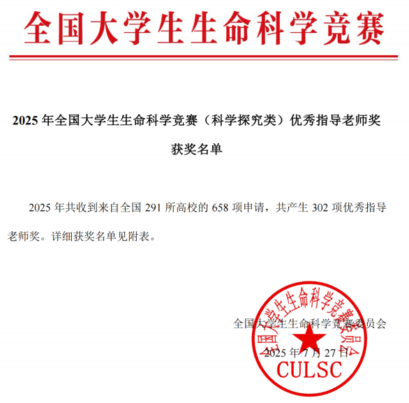本站讯(生科学院 供稿)7月27日,全国大学生生命科学竞赛委员会正式公布2025年全国大学生生命科学竞赛(科学探究类)优秀指导老师奖获奖名单,生科学院动物医学专业胡威老师凭借卓越的指导能力与突出的育人成果荣登榜单,成为本次评选中我校唯一获此殊荣的教师。