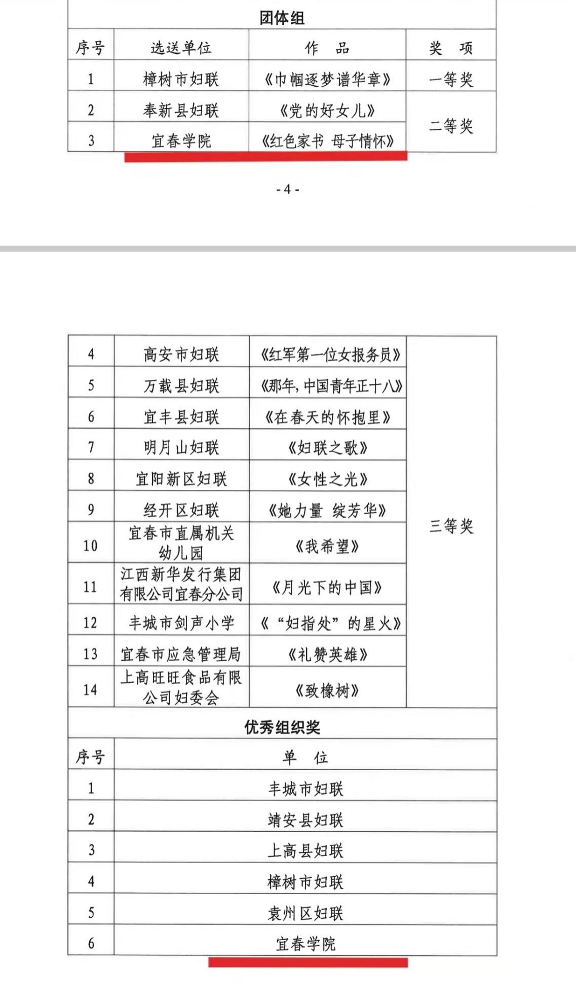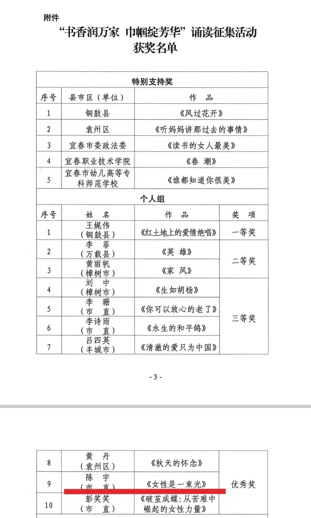 本站讯(工会 供稿)在日前揭晓的宜春市妇联书香润万家 巾帼绽芳华诵读活动评选中,宜春学院师生以优异成绩绽放光彩:宜春学院荣获优秀组织奖,马克思主义学院选送的《母子家书 红色情怀》斩获团体组二等奖, 审计处陈宇老师原创作品《女性是一束光》摘得个人组优秀奖。三项殊荣彰显了宜春学院女性师生赓续红色血脉、激扬时代精神的文化担当。