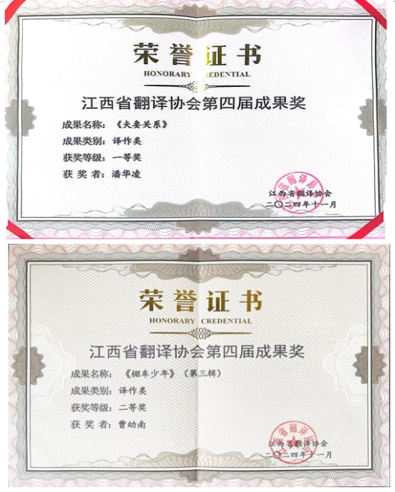 本站讯(外国语学院 供稿)近日,江西省翻译协会公布第四届全省优秀翻译成果奖评选结果。“资深翻译家”、我校外国语学院外聘教授潘华凌翻译的《夫妻关系》获译著类作品一等奖,曹幼南等教师合译的《棚车少年》(第三辑)获二等奖。 本届优秀翻译成果奖评审工作秉持“科学、严谨、务实”原则,通过公平、公开、公正的评选流程,从论著、论文、译著三类成果中遴选出具有社会价值的作品。该奖项凭借其严谨的评审流程与专业的评审团队,在业内树立了良好的口碑,获得了广泛的认可与赞誉,已然成为衡量省内翻译成果质量的重要标杆。 长期以来,外国语学院积极参与英汉互译跨文化传播与语言实践工作,成立了青年教师教师翻译工作坊,学院出版译著30余部100本,获江西省翻译协会优秀著作奖项8项、市社科优秀成果奖3项。其中《月亮宝石》获得央视科教频道《读书》栏目推荐,《汤姆·索亚历险记》等作品成为中小学阅读指导书目,《夫妻关系》已在第二届漓江文学奖评选中初评入围。这些翻译作品丰富了文化交流,提升了我校在翻译领域的影响力。未来,外国语学院将继续推动翻译工作在跨文化传播中的创新与发展,助力培养更多优秀的语言服务人才,为国际文化传播与交流事业做出更大贡献。