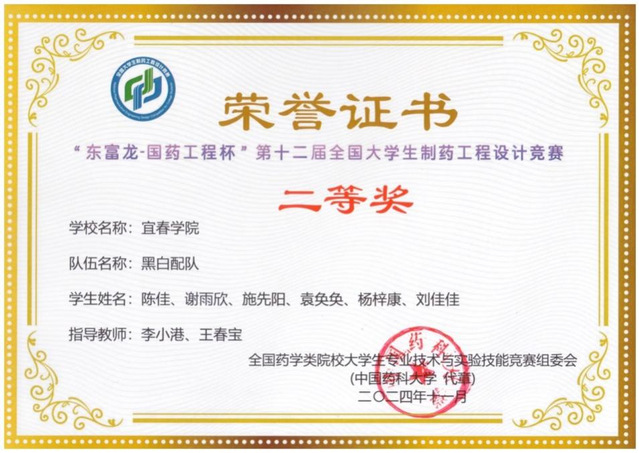 本站讯(特约通讯员 王春宝 陶华蕾)近期获悉,化学与生物工程学院学子在“东富龙-国药工程杯”第十二届全国大学生制药工程设计竞赛再创佳绩。此次大赛是由全国药学类院校大学生专业技术与实验技能竞赛组委会主办、东富龙科技集团股份有限公司与中国医药集团联合工程有限公司协办、重庆理工大学承办。该项赛事是目前我国高校制药工程专业层次最高、最有影响力的高水平专业赛事,是教育部高等学校药学类专业教学指导委员会指导推进制药工程专业发展的重要抓手。此次大赛共吸引180所高校参加,每所高校参与队伍数量不超过三支。 本次竞赛题目为“大容量注射剂生产车间工艺设计”,我校化学与生物工程学院三支代表队伍历经数月刻苦钻研和辛勤工作,最终顺利完成作品提交并全部获奖。化学与生物工程学院制药工程教研室教师朱智勇、周伟华指导的本科生团队“羊村守卫队”(成员:钱德艳、黄鑫、王欣、黄莉、洪娟娟、刘玮组)、教师李小港、王春宝指导的本科生团队“黑白配队”(成员:陈佳、谢雨欣、施先阳、袁奂奂、杨梓康、刘佳佳)均获得全国二等奖;由周蓉、蓝松两位老师指导的本科生团队“氨酚守己队”(成员:王姝懿、赵文、饶耀强、孙泽鑫、刘书诚、王怡洁)获得全国三等奖。