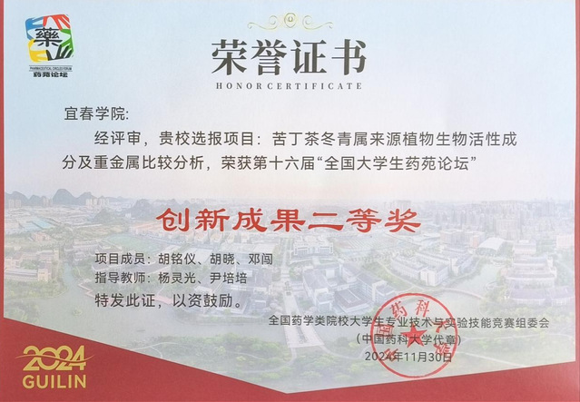 本站讯(学生通讯员 刘慧敏 欧阳昱舜)为培养大学生实践创新能力,11月23日,由全国药学类院校专业技术与实验技能竞赛组委会主办、桂林医学院承办的第十六届“全国大学生药苑论坛”圆满落幕。“药苑论坛”是全国高等教育药学类顶级赛事,本次论坛汇聚了全国药学领域的知名专家学者,来自北京大学、复旦大学、四川大学、中国药科大学等124所高校近600名师生线上线下参加,参赛高校和参赛作品数量均创历年新高。 本次论坛设立“药学科学”和“药学服务”两个赛道,共收到论文作品296篇、壁报作品286项,创新成果评选作品251项,最终评选出创新成果特等奖3项、创新成果一等奖16项、创新成果二等奖51项、创新成果三等奖74项、优秀论文奖55篇、优秀壁报奖20项。 化学与生物工程学院学子在老师的精心指导下,认真准备、积极备赛。杨灵光、尹培培老师指导的项目“苦丁茶冬青属来源植物生物活性成分及重金属比较分析”(学生:胡铭仪、胡晓、邓闯),获得“创新成果二等奖”。此外,推送的三个项目均获得“优秀壁报奖”。