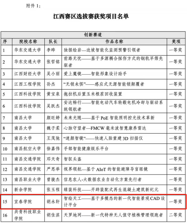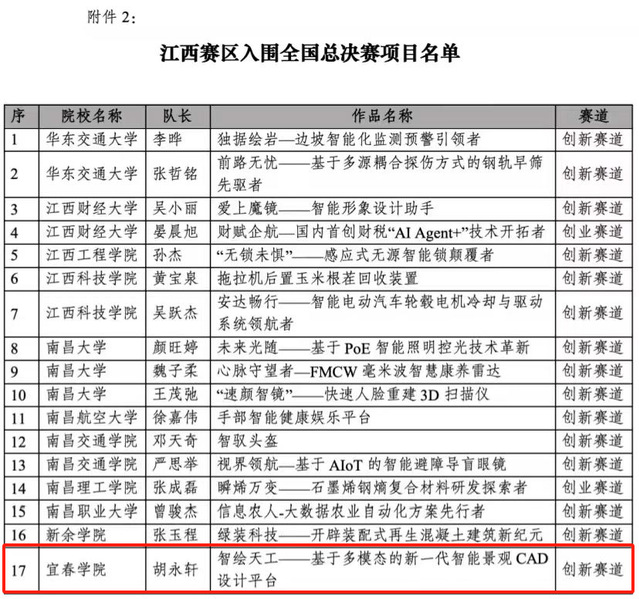 本站讯(生命科学与资源环境学院 供稿)2024年11月5日,iCAN大学生创新创业大赛组织委员会发布第十八届iCAN大学生创新创业大赛江西赛区选拔赛结果通知。其中,生命科学与资源环境学院师生获一等奖1项,三等奖1项。由胡永轩、钟亚城、方林、聂硕贤、胡志鹏组成的团队,在张夏、张羽威老师指导下完成的团队作品《智绘天工—基于多模态的新一代智能景观CAD设计平台》荣获江西赛区创新赛道一等奖,并成功入围全国总决赛。团队作品《随时养》荣获江西赛区三等奖。