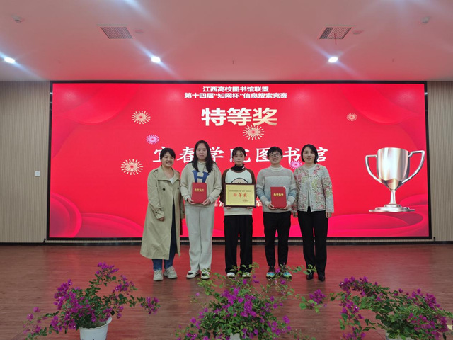本站讯(图书馆 供稿)10月29日,江西高校图书馆联盟第十四届“知网杯”信息搜索竞赛决赛在江西农业大学举行。经过长达一个月的初赛、校内选拔赛和联盟决赛的激烈角逐,我校化生学院研究生余浩、医学院吴子彦、汪雨萌三位同学最终在比赛中脱颖而出,总分排名第一,荣获特等奖,取得了宜春学院在此项赛事中有史以来的最好成绩。图书馆获团体特等奖,葛琳琳老师获“优秀指导老师”称号。