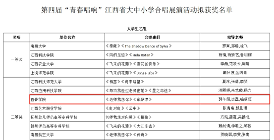 本站讯(记者 叶茂菲)近日,由江西省教育厅主办的第四届“青春唱响”江西省大中小学合唱展演活动拟获奖名单公布。经过激烈角逐,我校选送的合唱作品《老师我想你》《崴萨啰》荣获大学生乙组二等奖。