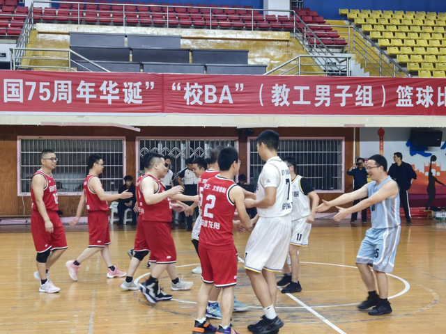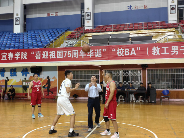本站讯(工会 供稿)10月24日,我校“喜迎祖国七十五周年华诞”“校BA”(教工男子组)篮球决赛在体育馆篮球场举办。校党委副书记、校长蔡海生,校党委委员、副校长余新卫等领导亲临现场指导,蔡海生校长作赛前讲话,并为比赛发球。