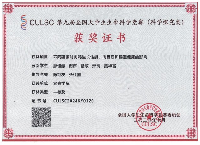 全国大学生生命科学竞赛是唯一一个生命科学领域的高水平大学生竞赛。竞赛每年举办一次,分为科学探究和创新创业赛道。本届比赛生命科学竞赛(科学探究类)共有629所高校的16732个团队参加,创新创业类有来自536所高校的6676个团队参加。比赛重在考察学生的原创能力、实验能力、团队合作能力、思辨能力及实验研究过程,竞赛级别高、参与人数多、完赛时间长、评审要求严。 生命科学与资源环境学院廖佳豪、谢辉、聂敏、邢玥、黄华富5位同学在陈继发、张佳鑫老师的指导下完成的“不同硒源对肉鸡生长性能、肉品质和肠道健康的影响”项目荣获全国一等奖。该项目的研究内容和实验设计得到了评审专家的高度评价,充分展现了生命科学与资源环境学院学子的科研潜力和团队合作精神。