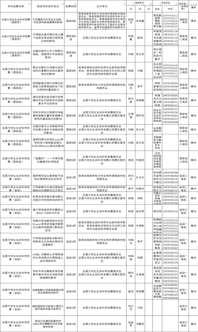 自赛事启动以来,生命科学与资源环境学院广泛动员全院师生参赛,积极做好组织工作。在这一年的参赛时间里,参赛学生反复与指导老师交流研讨,解决实验过程中遇到的问题,改进实验方法。参赛师生们实事求是、勇于创新,将理论知识与实践相结合,充分展现出扎实的专业知识,突出的实践能力以及追求创新、开拓进取的精神。 生命科学与资源环境学院将以此赛为契机,继续深化教育教学改革,进一步提升学生的科学素养和创新能力,做到以赛促学、以赛促教、以赛促研,切实促进学生全面发展。 获奖附录: