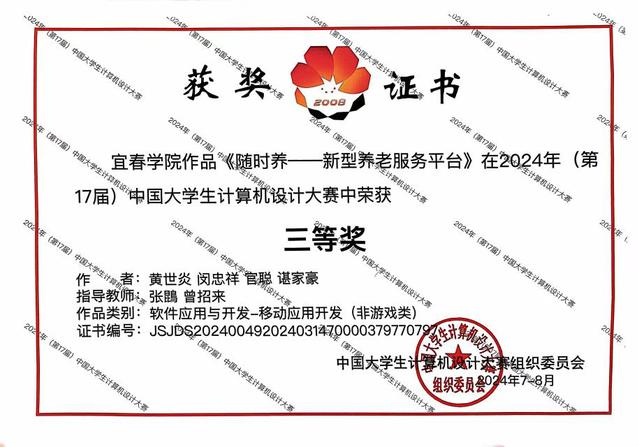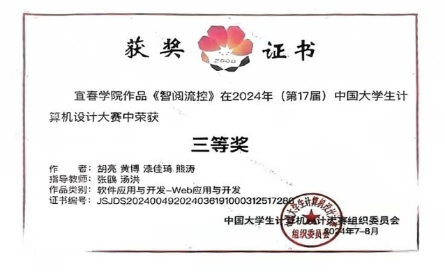 本站讯(数计学院 供稿)近日,由中国大学生计算机设计大赛组织委员会主办、山东大学和北京语言大学承办的2024年(第17届)中国大学生计算机设计大赛“软件应用与开发类”作品全国总决赛结果在山东大学威海校区揭晓,数计(服务外包)学院共两支队伍经省赛上推参加国赛并脱颖而出,斩获奖项。其中由胡亮、黄博、漆佳琦和熊涛等学生(张鵾、汤洪老师指导)完成的作品《智阅流控》,由黄世炎、闵忠祥、官聪和谌家豪等学生(张鵾、曾招来老师指导)完成的作品《随时养——新型养老服务平台》均在本次大赛中荣获三等奖。