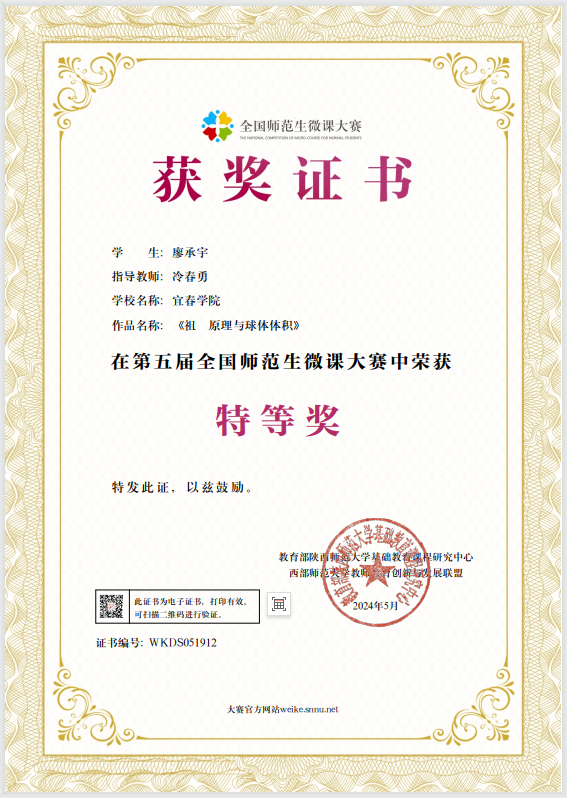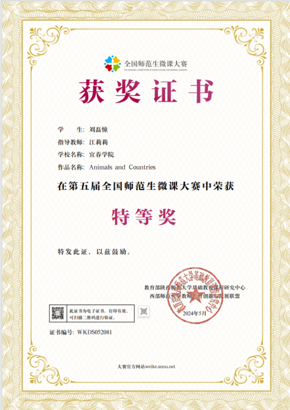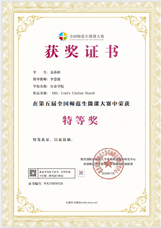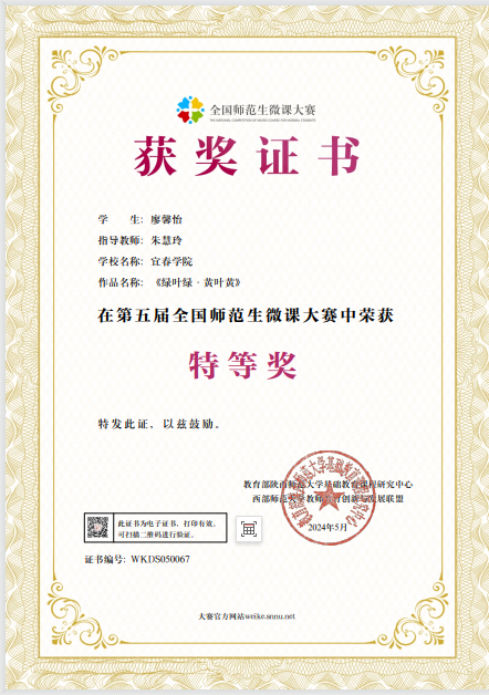 本站讯(特约通讯员 卢怡)近日,从全国师范生微课大赛官方平台传来喜讯,我校参赛的20件微课作品在第五届全国师范生微课大赛中均获得奖项,其中外语学院金莎婷、刘磊憧,音舞学院廖馨怡,数计学院廖承宇等4位同学荣获特等奖,其余作品分别荣获一等奖2件,二等奖10件,优秀奖4件;我校江莉莉、李慧懿、朱慧玲和冷春勇等教师获评微课大赛“优秀指导老师”。在师范教育学院精心组织下,我校第五次荣获了该项赛事的“优秀组织院校”奖。 第五届全国师范生微课大赛由教育部陕西师范大学基础教育课程研究中心和西部师范大学教师教育创新与发展联盟主办,旨在通过比赛提升师范生信息化教学能力,促进信息技术与教育教学深度融合,促进数字教育资源共建共享。本次比赛的开赛时间在去年12月底,虽然时间紧、任务重,但学校相关部门高度重视,师范教育学院就竞赛进行了周密部署,各师范专业教学院在寒假期间认真准备、积极参加。今年3月初,通过教学院的院级初赛推荐出34件作品参加全校决赛,并最终在校级决赛中评选出20件优秀微课作品上报全国总决赛组委会,再度在此次竞赛中获得喜人佳绩。