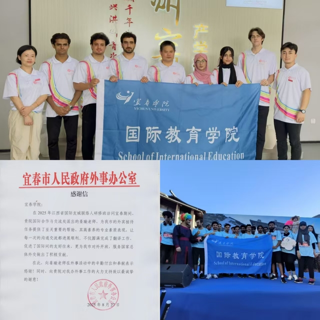 服务地方经济建设发展 这个暑假,我校国际合作与交流的足迹不仅迈向全球,更深植于宜春沃土,以实实在在的行动诠释了高校外事工作服务地方经济发展的新内涵,展现了“不一样”的担当与作为。今年8月,我处国际交流科姜璇副科长以高度的政治责任感、精湛的外语能力和出色的综合素质,密切配合宜春市人民政府外事办公室,顺利完成了2025年江西省友城联络人研修班在访问宜春期间的外事活动,得到了市外办的高度认可。同时积极配合宜春市融媒体中心、宜春市妇联和明月山管委会等部门,选派优秀留学生们参加“瓷韵农耕·青春筑梦”“水江假发基地参观”“明月山夏日追光夜跑活动”“明月山七夕晚会”“宜春市国际职业篮球对抗赛”等活动。这不仅是一次次活动的串联,更是我校促进中外人文交流,将国际化资源转化为服务宜春经济社会发展动能的生动实践。