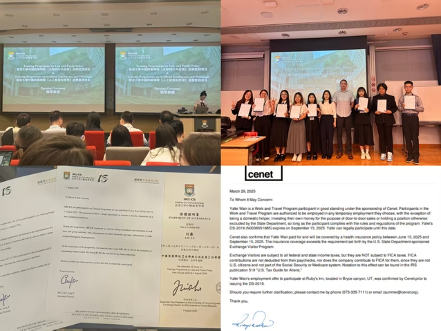 学生出国(境)交流实践 国(境)外长短期研学和实践项目不仅为我校学子提供了高水平学术平台和国际交流平台,让我校学子体验了不一样的“国际化”假期,更是他们勇敢走向世界,在国际交流与合作中展现中国青年风采与担当、知行合一的最佳诠释。7月27日,政法学院23级法学专业刘露、卢珺仪,24级城市管理专业廖奕婷与来自全国多所高校的优秀学子赴香港大学参加了为期一周主题为“法学与公共政策”短期研学项目,项目内容涵盖专题学术课程、大师讲堂及文化体验等内容。外国语学院24级法语班学生万亚菲赴美国犹他州参加暑期社会实践项目,在实践中提升语言的应用能力。这些不一样的假期经历,满载而归的体验,不仅标志着学生国际化视野的拓宽与跨文化沟通能力的提升,也为我校国际化人才培养模式的不断深化,持续拓展高水平国际合作与交流新篇章奠定了基础。