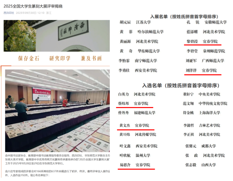 本站讯(美术与书法学院供稿)9月30日,2025全国大学生篆刻大展评审揭晓,美术与书法学院书法学专业本科生黎碧滢、刘洋洋2位同学篆刻作品入展(最高奖),蔡炜邦、黄文杰、易思含3位同学篆刻作品入选。 2025全国大学生篆刻大展由中国书法家协会、教育部中国书法教育指导委员会指导,西泠印社、华东师范大学联合主办。