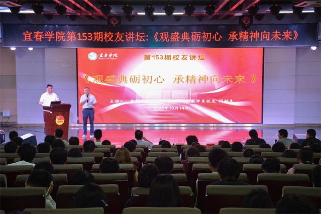 本站讯(学生记者 温雅晴 陈杰)金秋十月,丹桂飘香。10月14日下午,宜春学院校园内暖意融融,第153期校友讲坛在师生的期待中如期举行。本次讲坛特别邀请到我校1996届数学系杰出校友、江西省奉新县第一中学校长闵嗣生重返母校,以“观盛典砺初心,承精神向未来”为主题,与母校师生共话教育理想,分享育人经验。招生就业处(校友事务中心)处长段军平,人工智能与信息工程学院党委书记胡红武、院长臧爱彬及数学系教职工、师范类专业学生聆听了讲座。讲座由人工智能与信息工程学院党委书记胡红武主持。